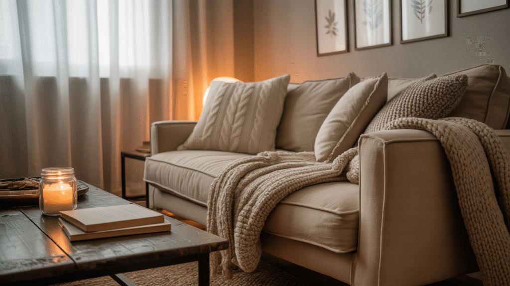 Lighting Transformation: Swap standard bulbs for warm-toned ones, add one new table lamp from a discount store, and introduce inexpensive string lights or candles. Lighting changes are the most cost-effective way to increase coziness.