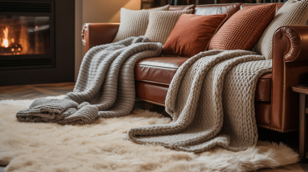 Blanket Layering Strategy: Keep multiple throws in different textures accessible. Drape a chunky cable-knit blanket over your sofa arm, fold a soft fleece throw on an ottoman, and store a faux fur throw in a decorative basket nearby. This variety allows household members to choose their preferred texture and ensures you’re never without a warm layer.