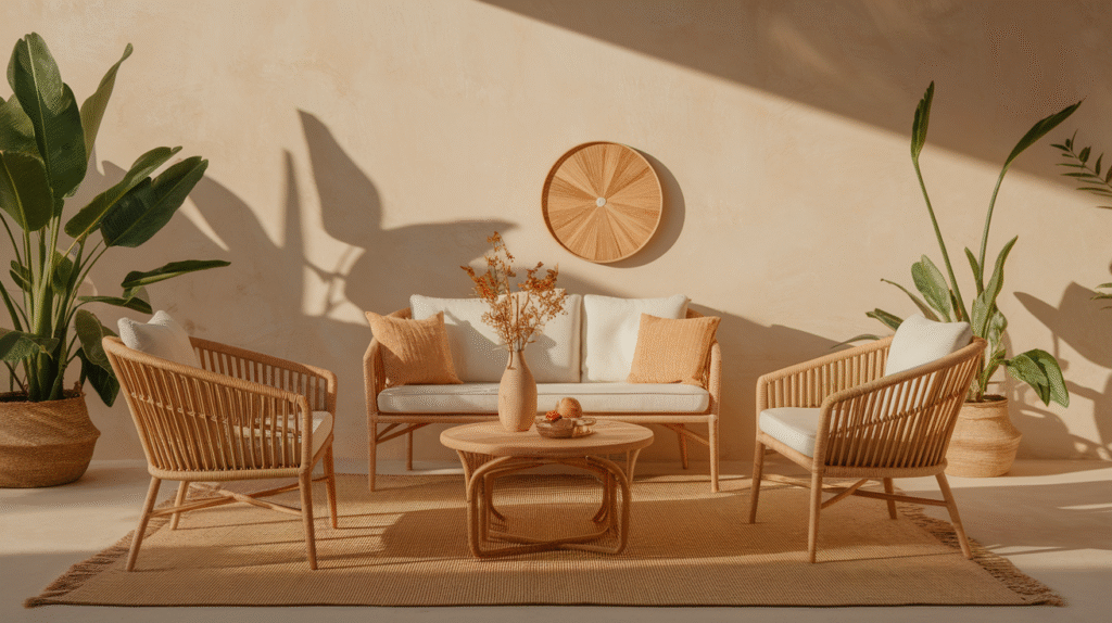 Start with a neutral base—this is non-negotiable. Paint walls in soft white, warm beige, or gentle gray. Choose flooring in natural wood tones or light stone. Select your large furniture pieces (sofa, main seating) in solid, neutral fabrics. This foundation lets your rattan pieces shine without competing for attention.