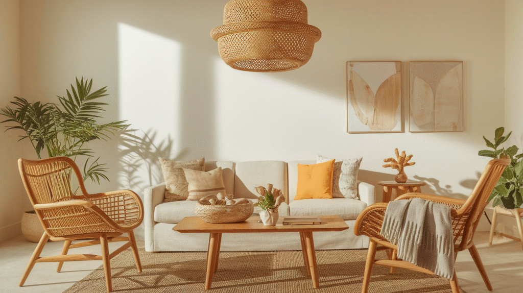 Pro tip: Don’t go overboard. Mix your rattan pieces with solid wood furniture for perfect balance. If you have a rattan chair, pair it with a solid wood sofa. If your coffee table features rattan, keep your side tables simple wood or ceramic. This approach prevents the space from feeling too busy or themed.