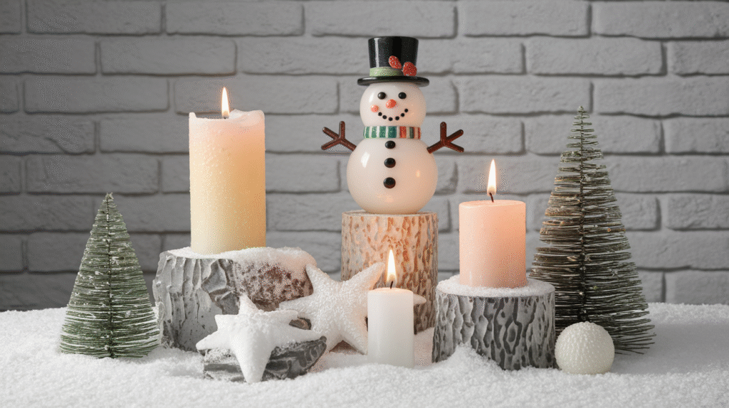 For those who appreciate whimsy alongside elegance, create stacked candle displays that evoke snowmen. Use three pillar candles in graduating sizes, stacking them securely (place the largest on bottom for stability). Add miniature accessories: wrap a small scrap of fabric as a scarf, use buttons or beads for eyes, and insert small twigs as arms.